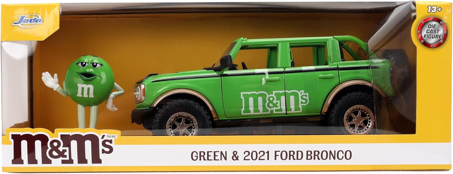Jada Hollywood Rides M&M'S 2021 Ford Bronco con Figura de Metal Verde M&M'S – Coche Fundido a presión con Puertas de Apertura, Escala 1:24, a Partir de 8 años, Juguete Coleccionable para niños y