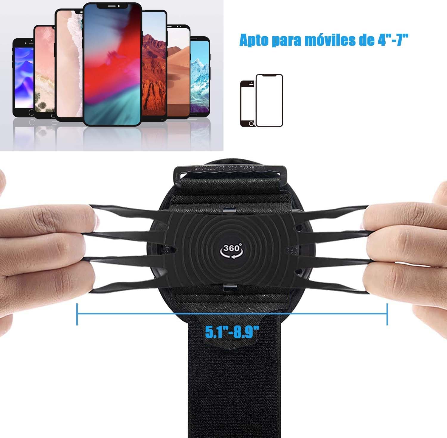 Soporte para teléfono de muñeca, 360°Bandas para Brazo para iPhone 15/14/13/Pro Max/Pro/XR/X/8/7/Plus, se Adapta a Todos los Smartphones de 4-6,7 Pulgadas,para Running Senderismo