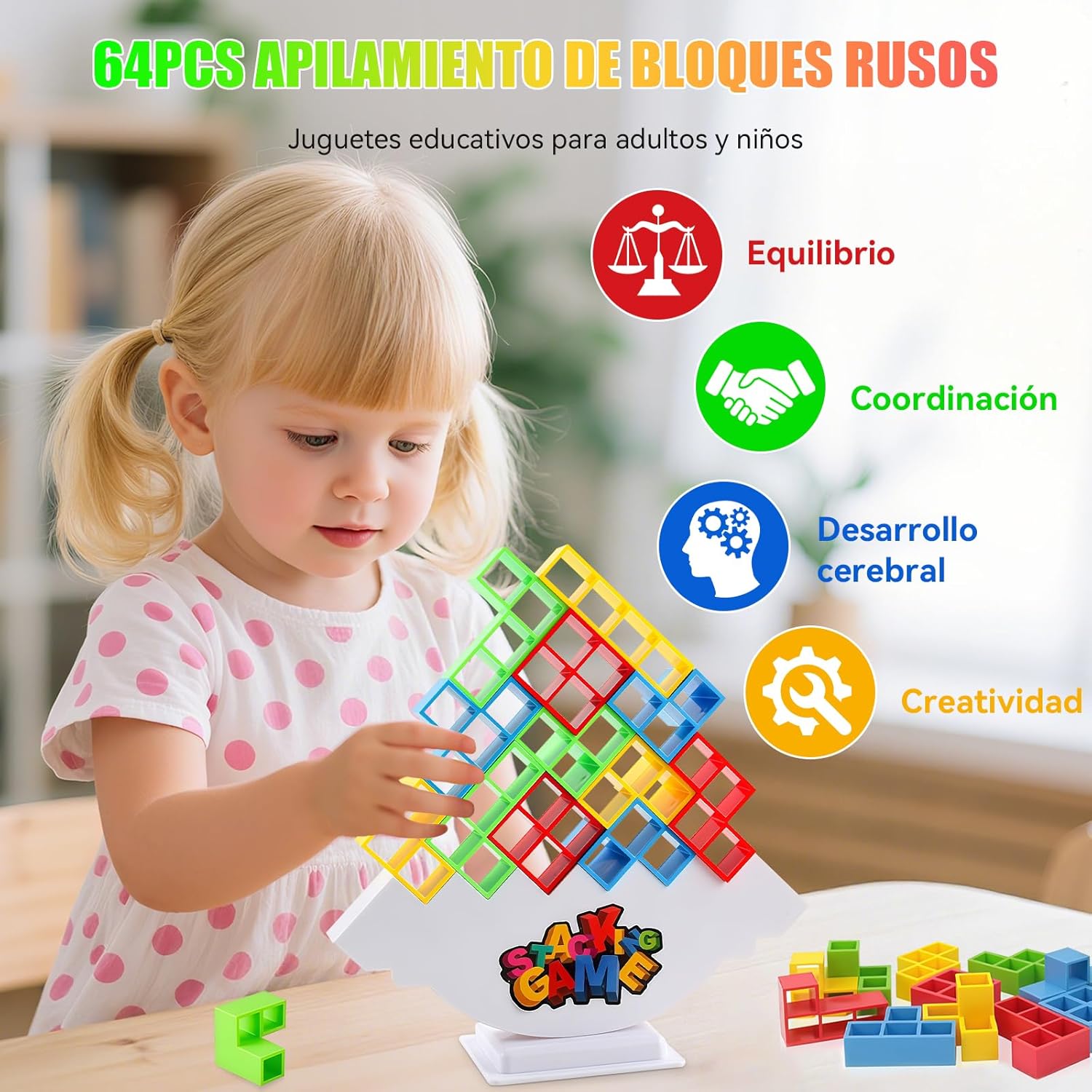 LUHI Juguete de Apilamiento con Equilibrio,juego equilibrio,juguete apilamiento,Bloques Rusos de 64 Piezas,Un juego de equilibrio apto para todas las edades,y un regalo ideal para cumpleaños oNavidad.