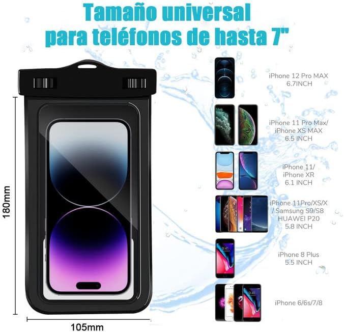 - 【IPX8 Certified Waterproof】La funda de teléfono impermeable flotante profesional certificada IPX8 está especialmente diseñada para actividades al aire libre como piscina, playa, pesca, natación, vela, esquí, paseos en bote, kayak, snorkel, tubing, rafting, ducha, sauna y otras actividades de parque acuático, manteniendo su teléfono completamente funcional y 100% de protección impermeable.