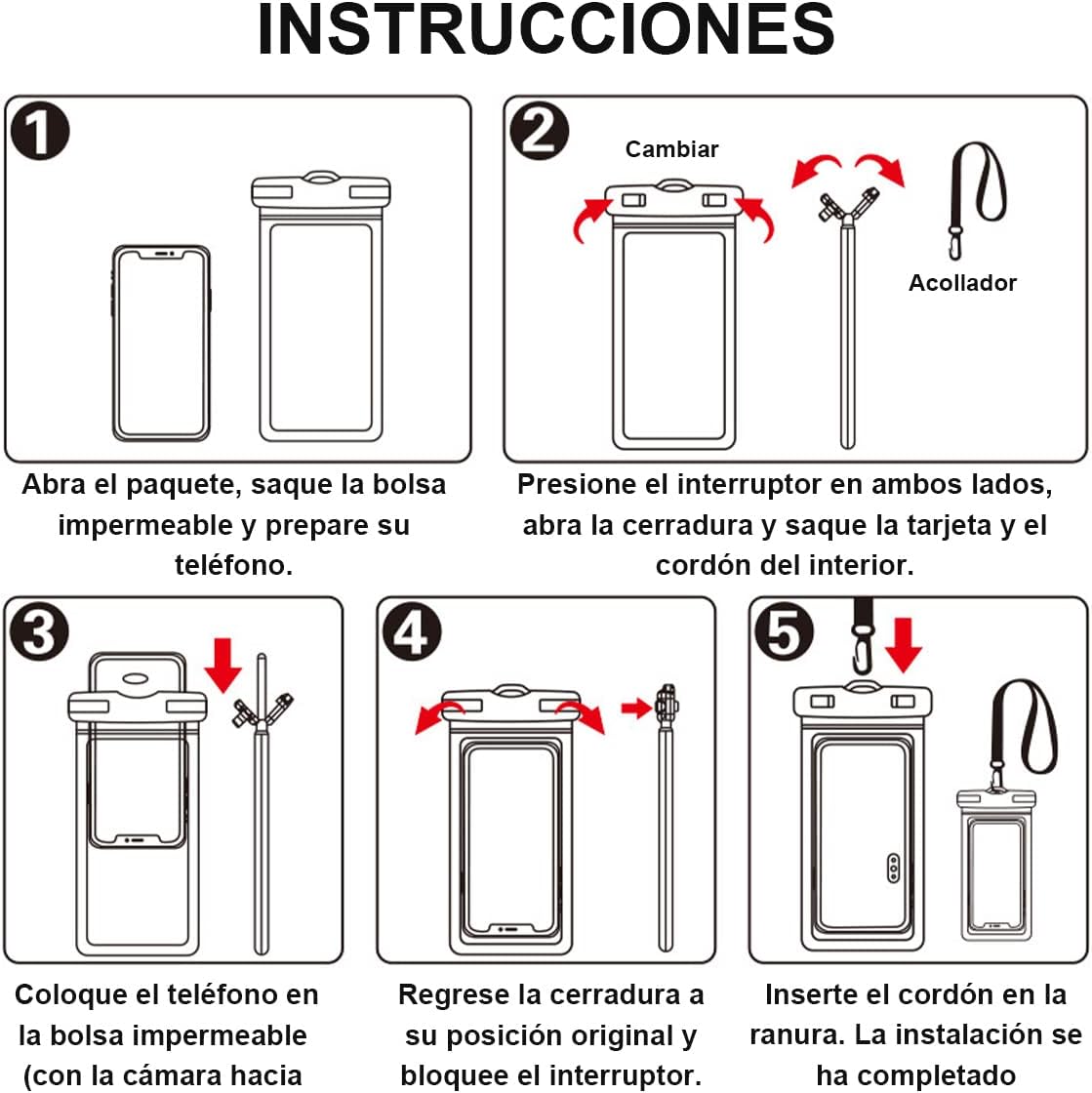 - 【Complete Protection】Mecanismo de bloqueo seguro, simplemente gire los dos pestillos laterales para abrir y cerrar la bolsa, manteniendo su teléfono bolsa impermeable completamente sellada bajo el agua con un cordón ajustable desmontable.Espacio grande de 6,5 pulgadas (no hay necesidad de preocuparse por llevar una funda) y protección de colchón de aire para evitar caídas accidentales y arañazos, proporcionando una protección completa para su teléfono.