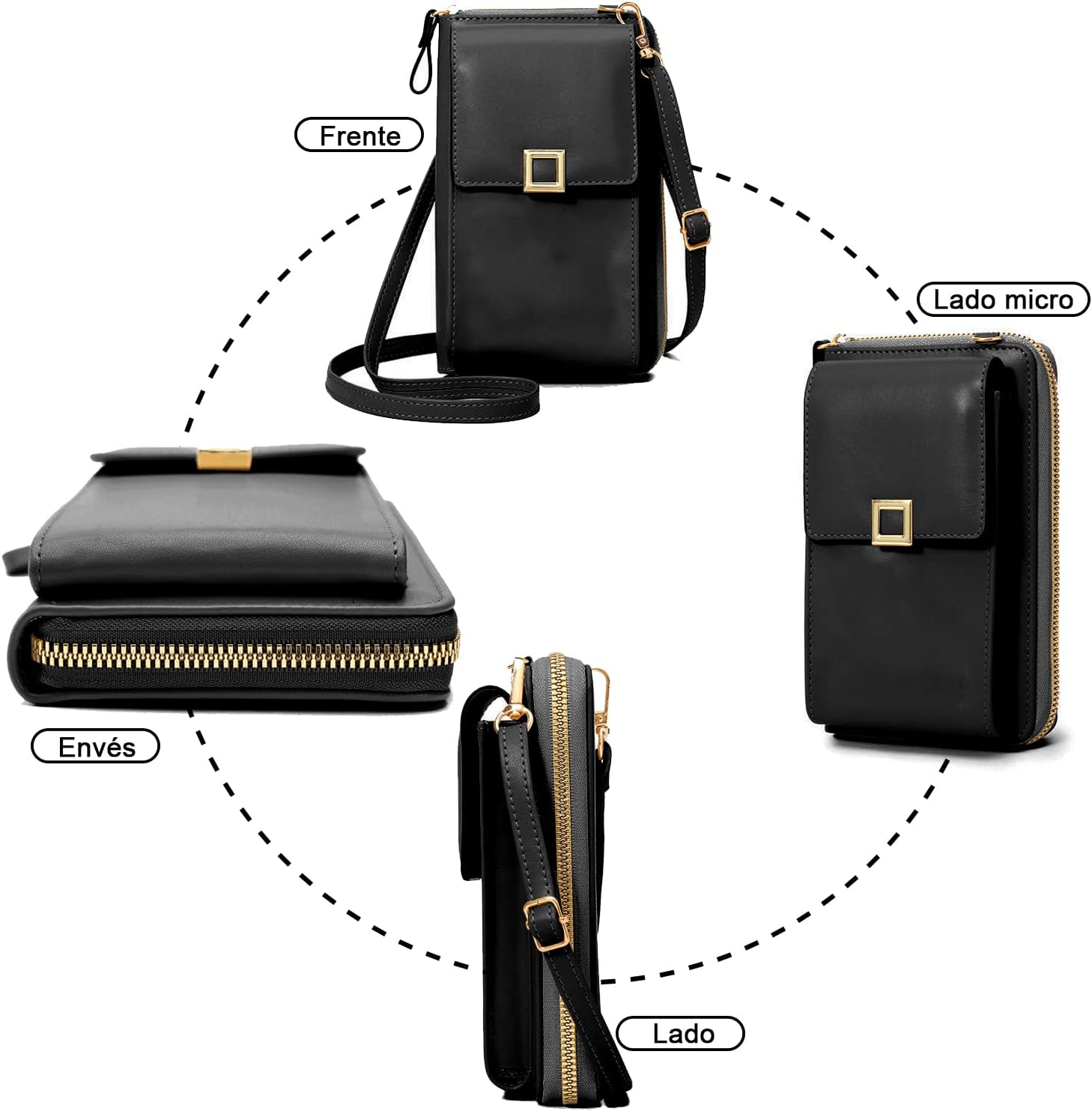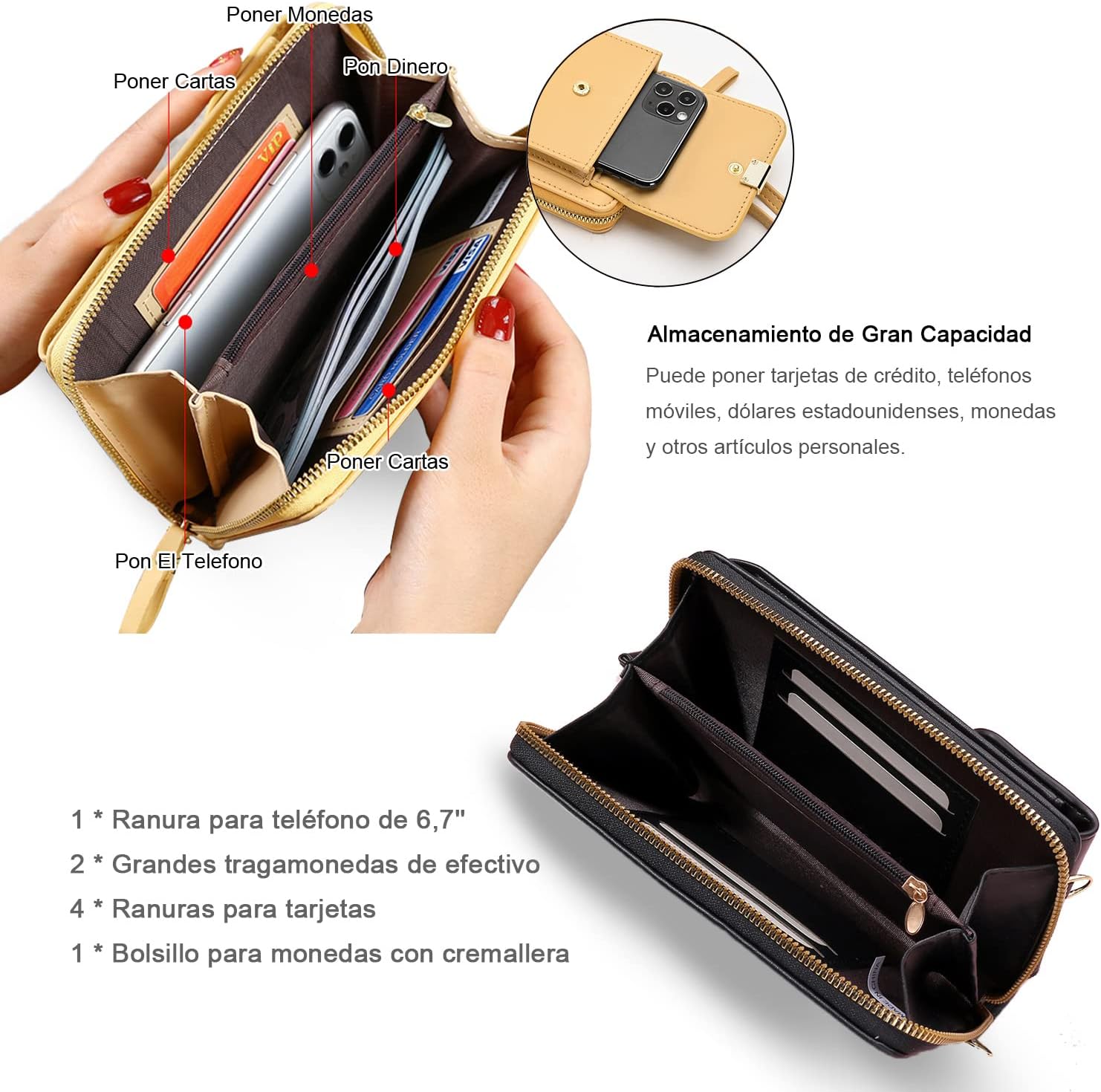 - 🌈【Estructura Espaciosa】Muti-bolsillos diseños proporcionan más espacios y mantener bien organizados los elementos esenciales diarios como teléfonos, carteras, papel servilleta, lápices de labios, monedas, tarjetas, llaves, etc.1 x Bolsillos delanteros de teléfono con cierre de broche de presión; 1 x Bolsillo principal con cremallera; 2 x Compartimentos pequeños; 1x bolsillo interior con cremallera para guardar monedas; 4 x ranuras para tarjetas de crédito.