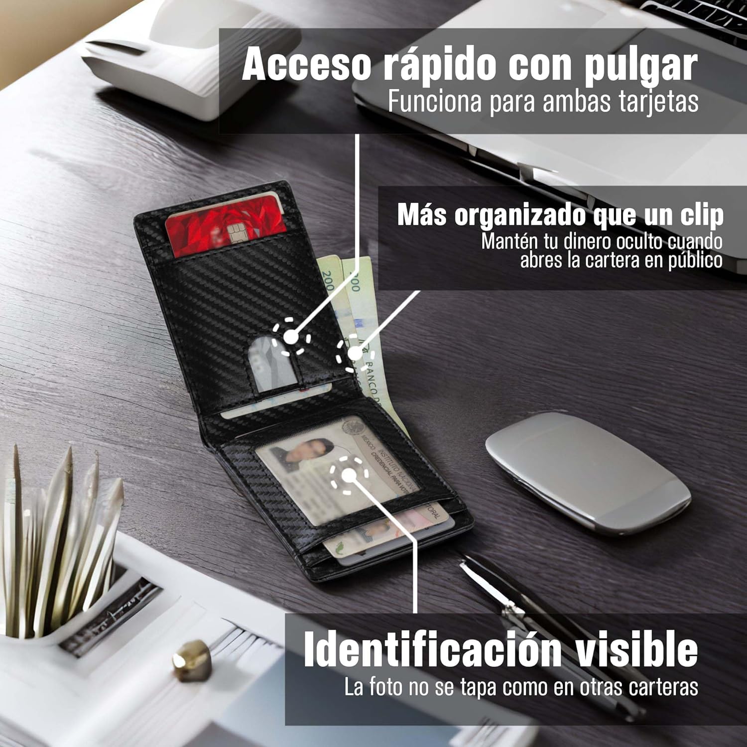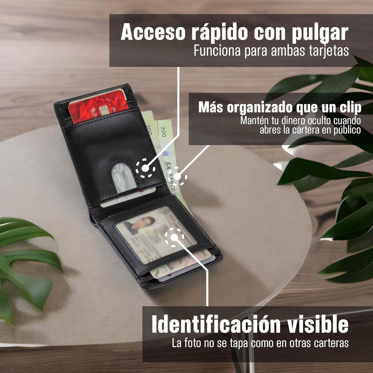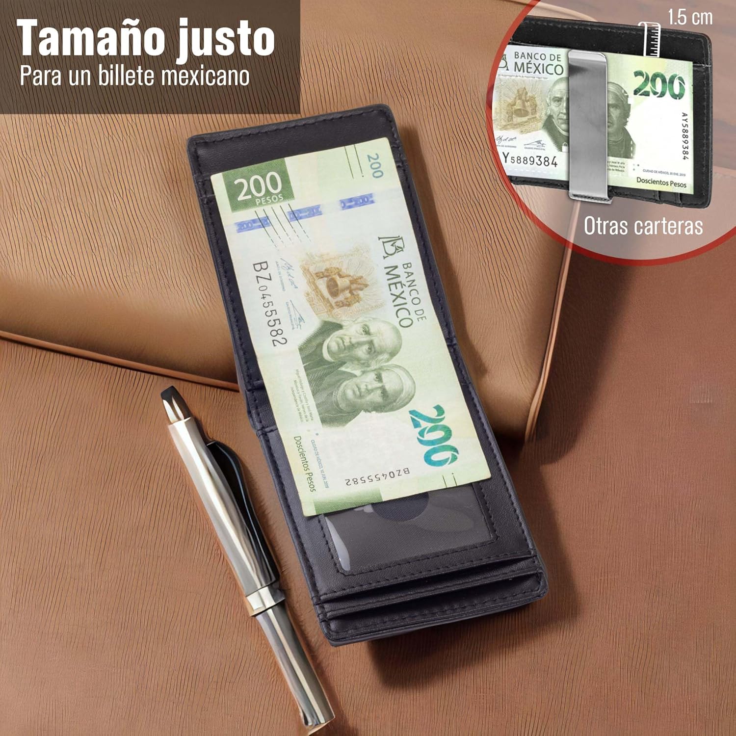 - APERTURA PARA BILLETES y MONEDERO CON ZIPPER: Lleva tus billetes en la abertura hecha justo a la medida de un billete mexicano. Evita mostrar tu efectivo como lo hacen las carteras de clip. Mantén tus billetes organizados por orden y accede a ellos con facilidad. Guarda tus monedas u otros objetos pequeños en el zipper del espacio exterior y asegura que no se pierdan al manejar la cartera.