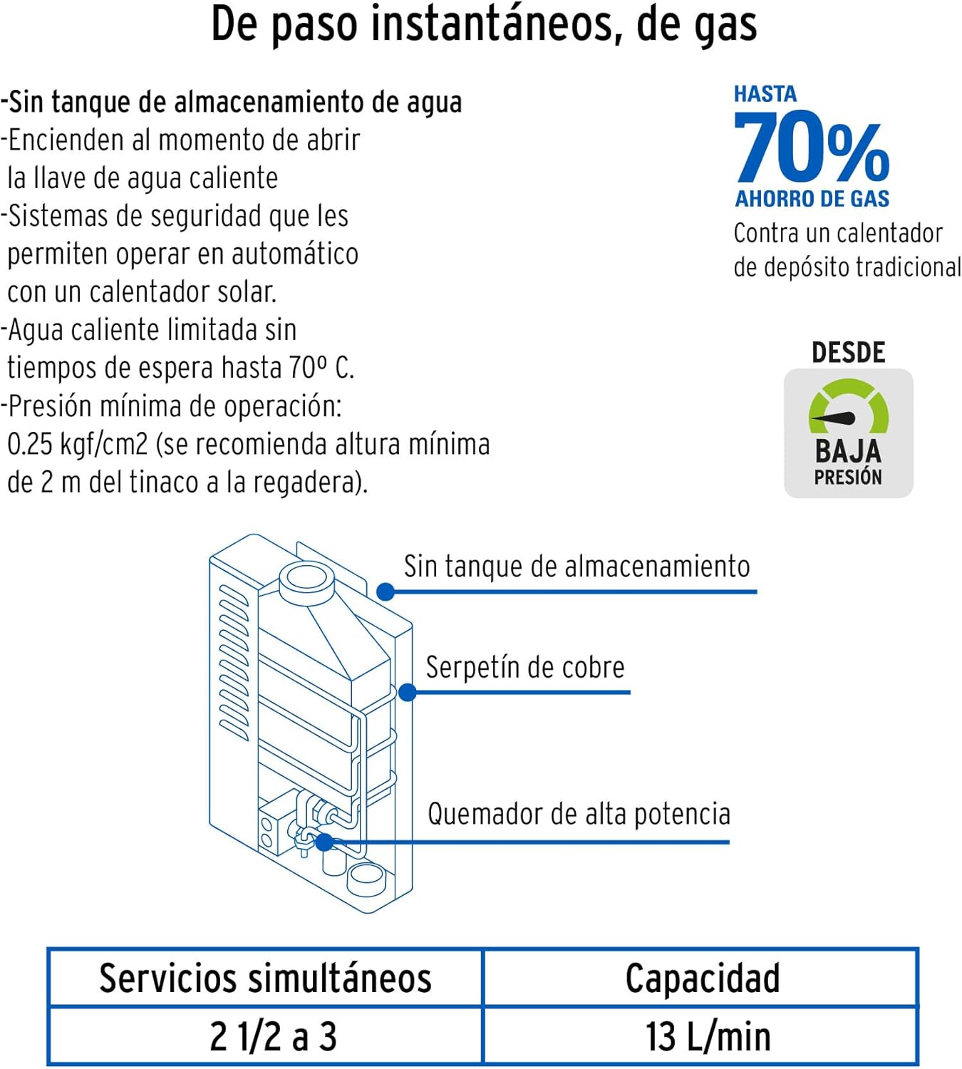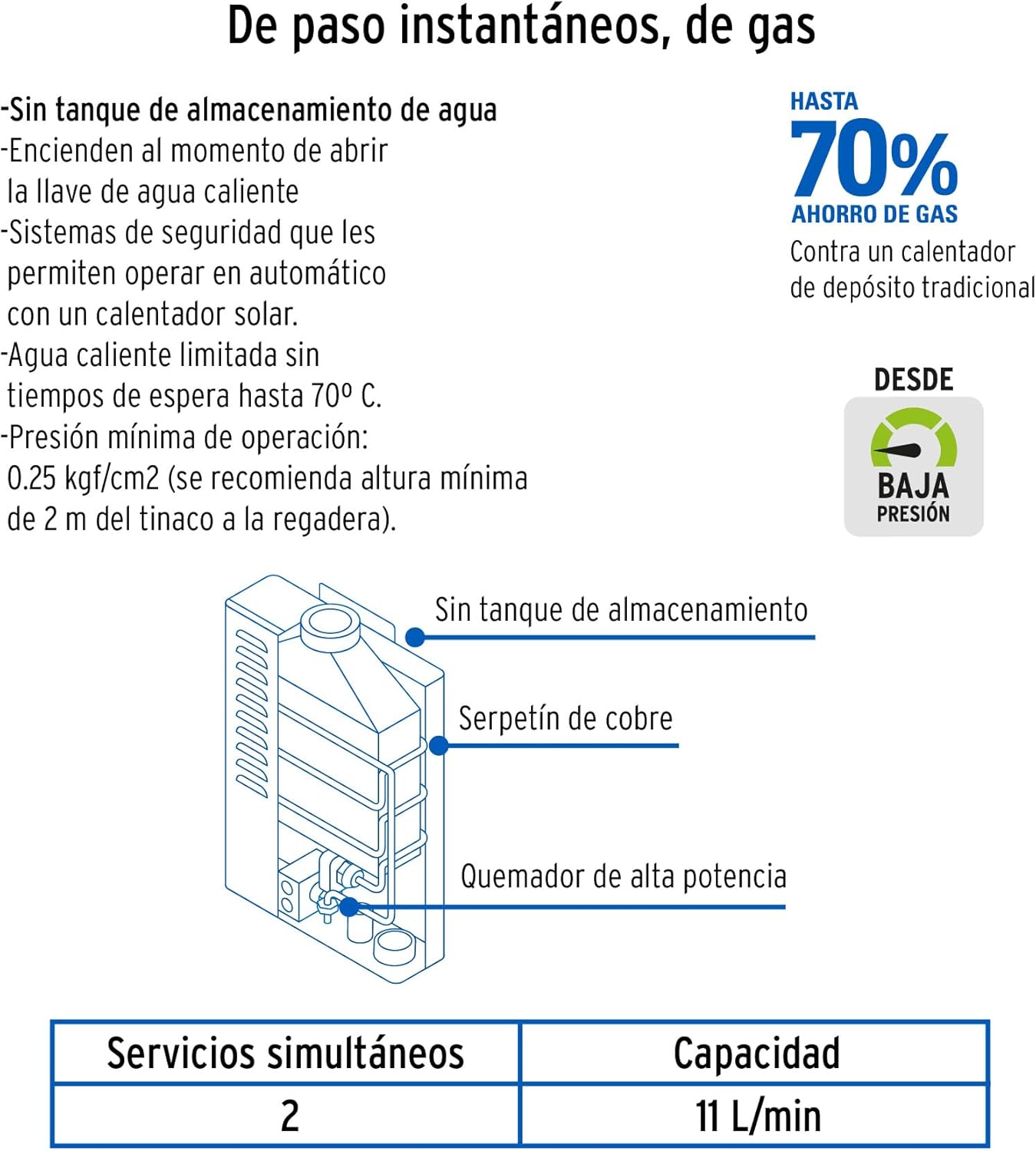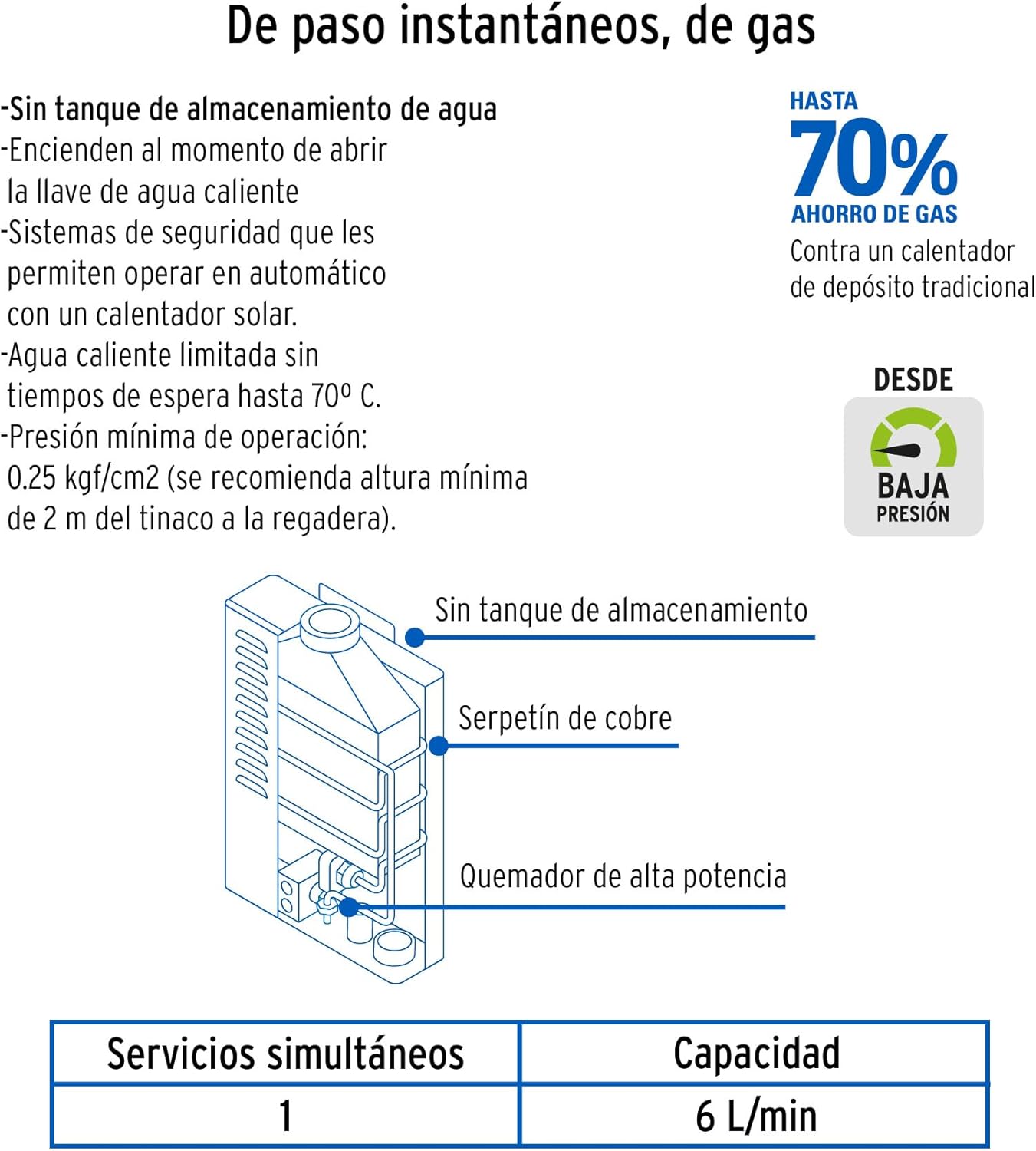 - Presión mínima de operación 0.25 kgf/cm²