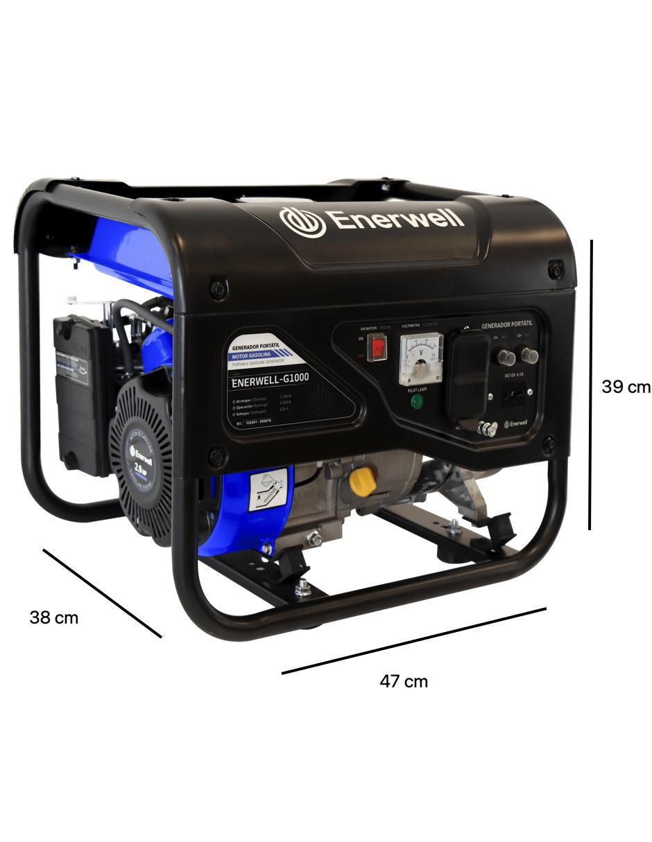 Generador portátil a gasolina. Método de arranque: Manual. Potencia en operación: 1,000 W. Voltaje de salida: 1 x 120 VCA. Cilindrada: 98 cc. Incluye: Embudo para llenado de aceite, kit de mantenimiento de bujías, destornillador, dos clavijas, cable con pinzas tipo caimán (1 metro), filtro de aire, indicador de aceite e indicador de gasolina. Potencia: 2.9 hp. Tiempo de operación continua: 9 horas Panel de control (Conexiones): 1 Contacto dúplex 120 VCA (15 A), 1 contacto 12 VDC (8.3 A). Decibeles en operación (7 metros): 65 dB. No. Cilindros: 1 Tiempos del Motor: 4 Bujía F5T, F6TC, F7TJC. Características: Tanque de gasolina de gran capacidad, soporte de tubo de acero endurecido. Tanque de combustible: 6 litros (Gasolina). Aceite recomendado: SAE 10W-30 o 10W-40 (No incluido). Capacidad de aceite: 0.37 litros Enfriamiento: Aire