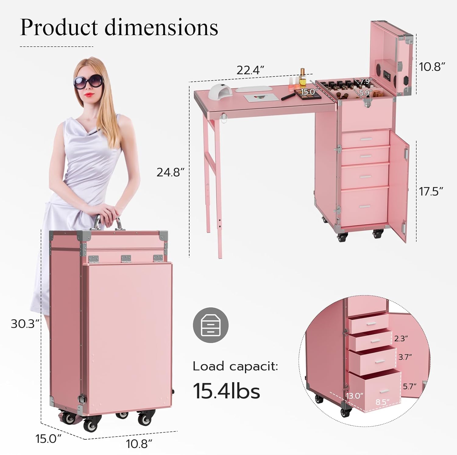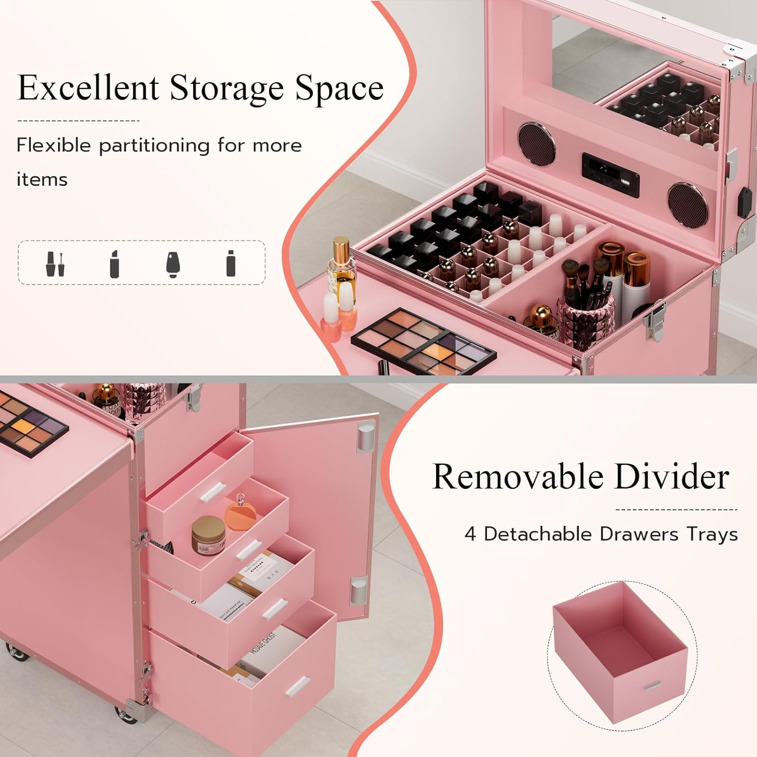 - Espacio de almacenamiento adecuado: amplio espacio de almacenamiento y particiones razonables. El espacio en el compartimento es perfecto para mantener el esmalte de uñas o el lápiz labial. Junto a ella puedes colocar lámparas de uñas o secadores de pelo. 4 cajones de diferentes alturas hacen que sea fácil organizar tus artículos de acuerdo a su tamaño