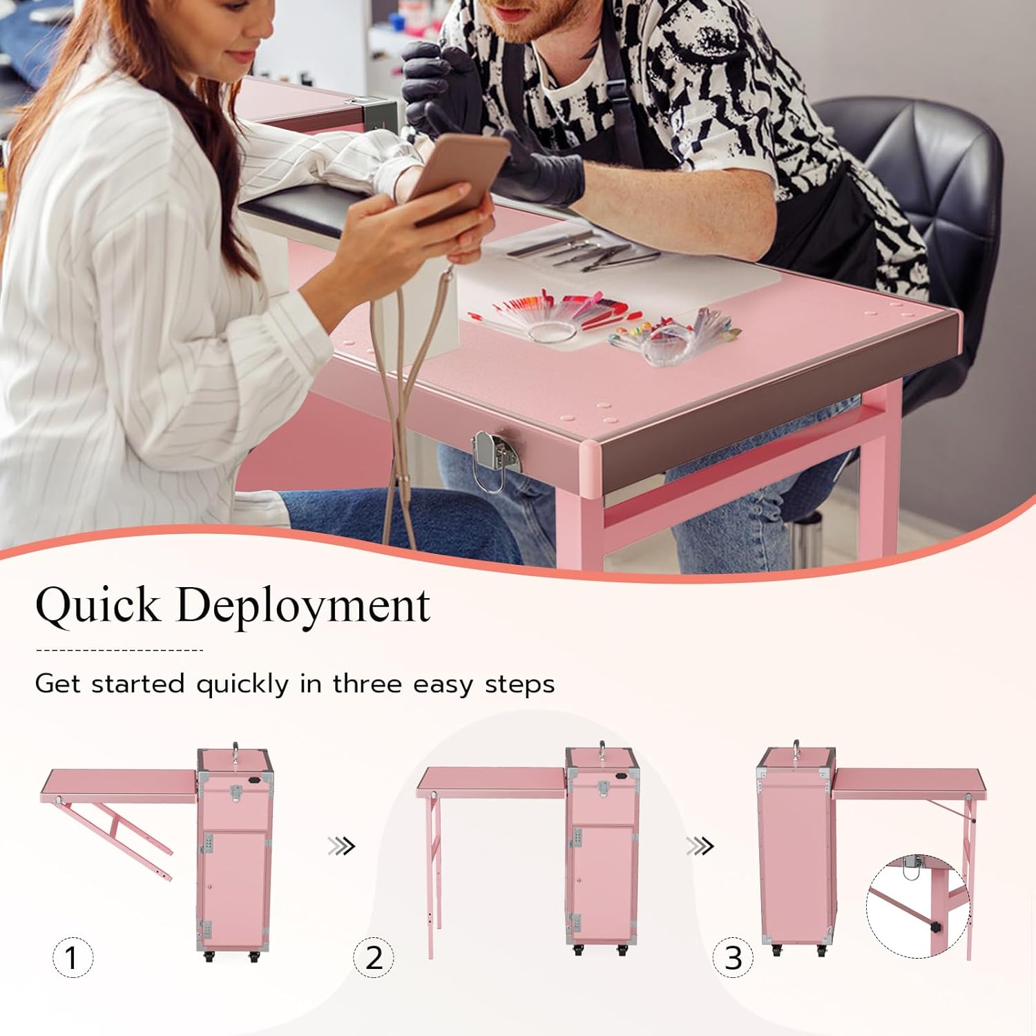 - Múltiples usos: se puede utilizar en casa, en un salón de uñas. Y más adecuado para técnicos de uñas y esteticistas para llevarlo cuando proporciona servicio en casa. Como mesa de maquillaje temporal para la novia también es genial. Actuaciones callejeras, puestos de accesorios en el mercado de pulgas, cabinas de pintura facial... Es omnipotente