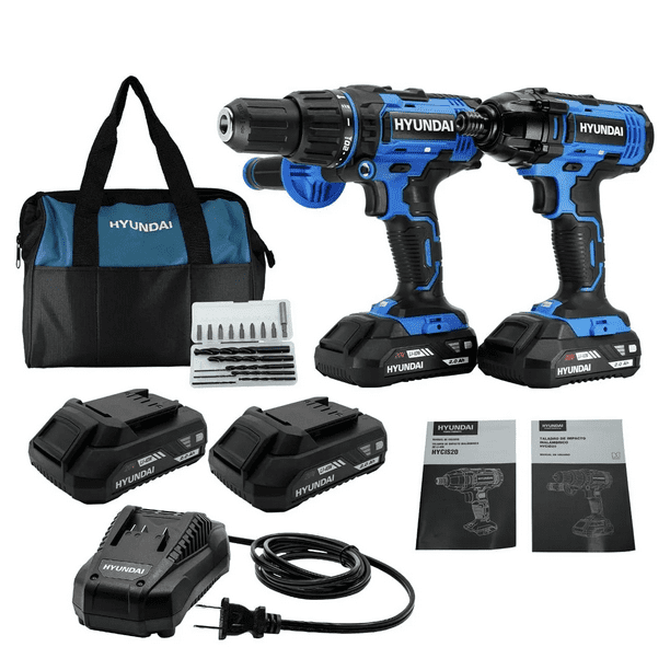NUEVO Kit de herramientas inalámbricas que contiene 1 taladro de impacto HYCID20 y 1 atornillador de impacto HYCIS20 marca HYUNDAI.