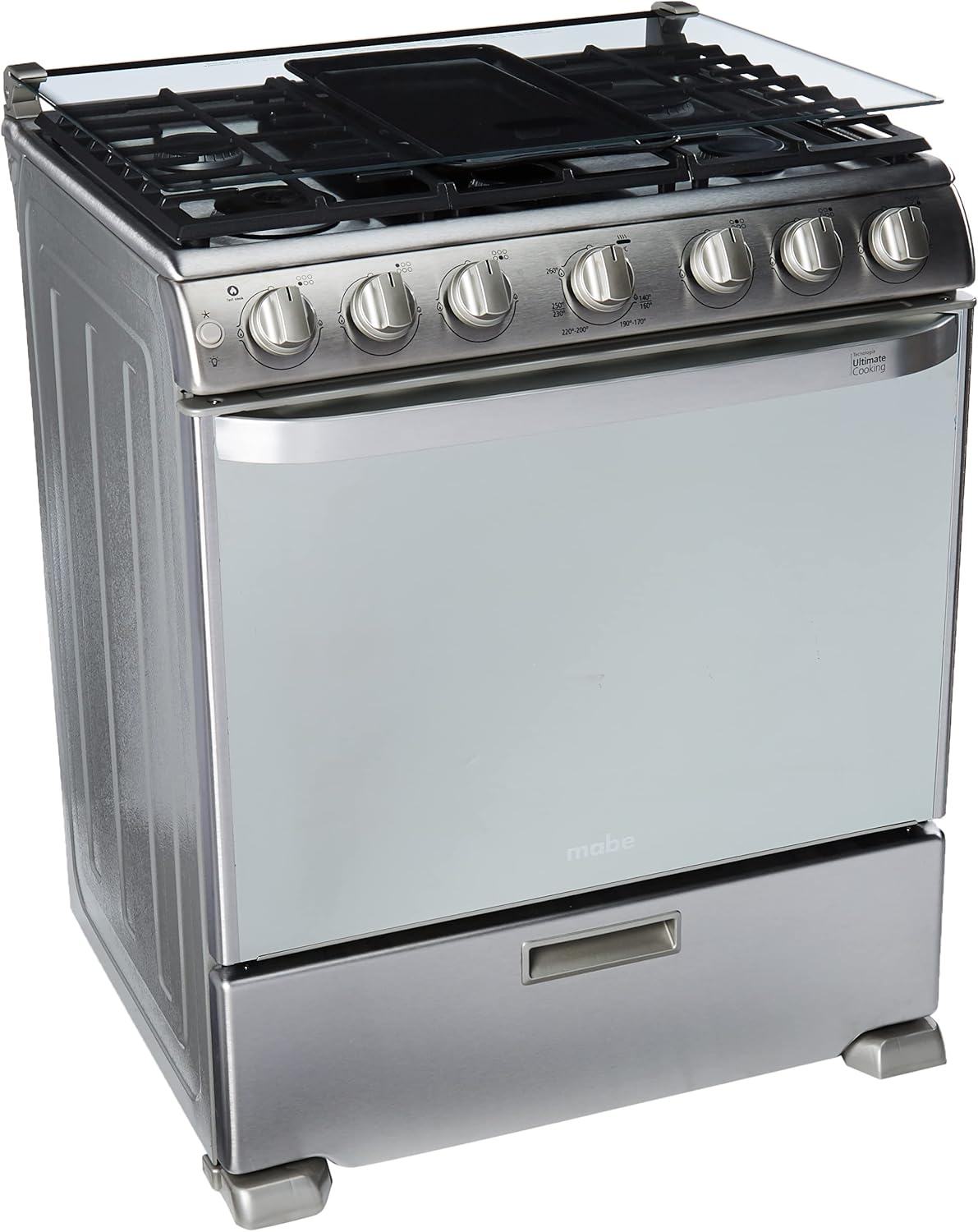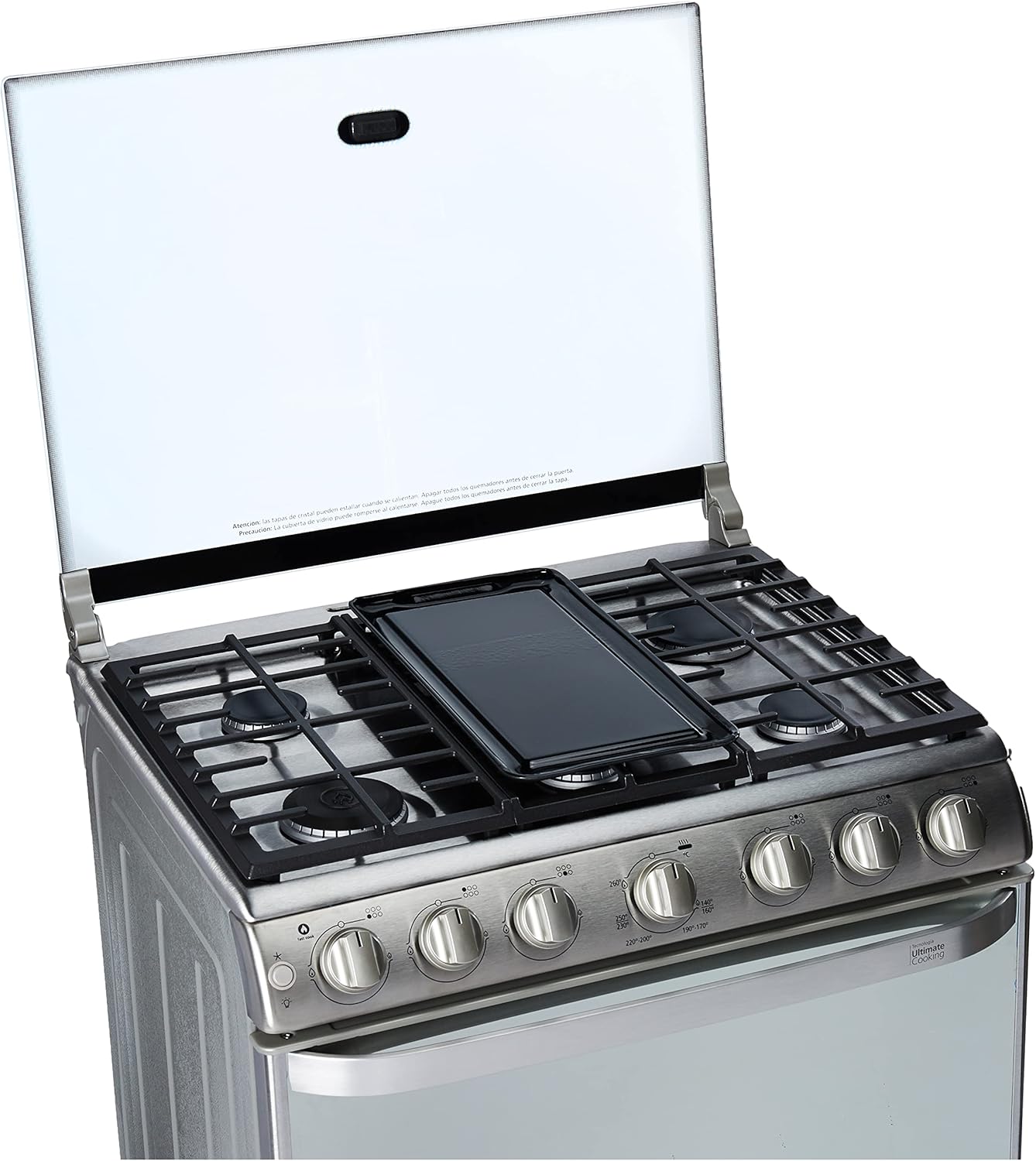 - Gas LP, capelo de cristal templado, comal teflonizado, 3 parrillas superiores de fundición, cubierta sellada de acero inoxidable, encendido electrónico por botón