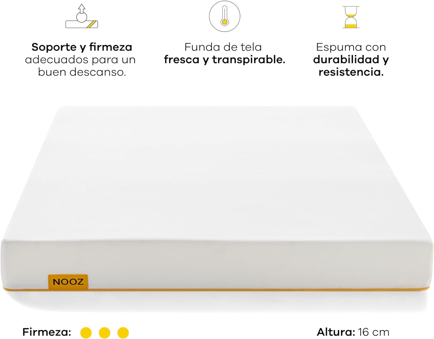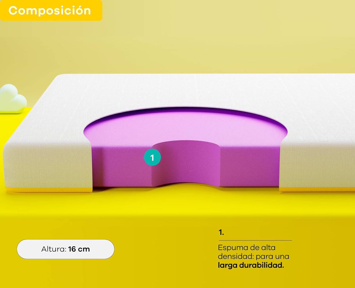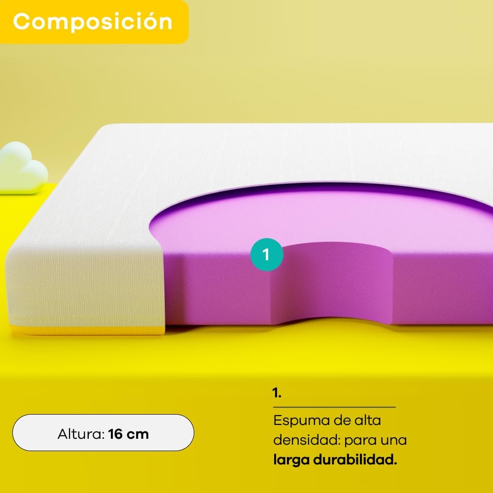 - Soporte y Firmeza: 16 cm de espuma que brindan soporte y alineación a tu cuerpo, eliminando puntos de presión, para tener un buen descanso.