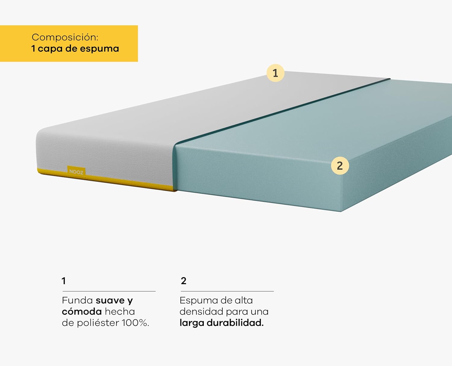 - Cuidado fácil: Límpia el exterior de tu colchón con un trapo húmedo, pero evita mojarlo, ya que su composición es de espuma y puede dañarse. Apenas retires el plástico, tu colchón Nooz Essential retomará entre 90% y 95% de su tamaño y altura total. En un lapso de 24 a 72 horas tu colchón retomará el 100% de su altura.
