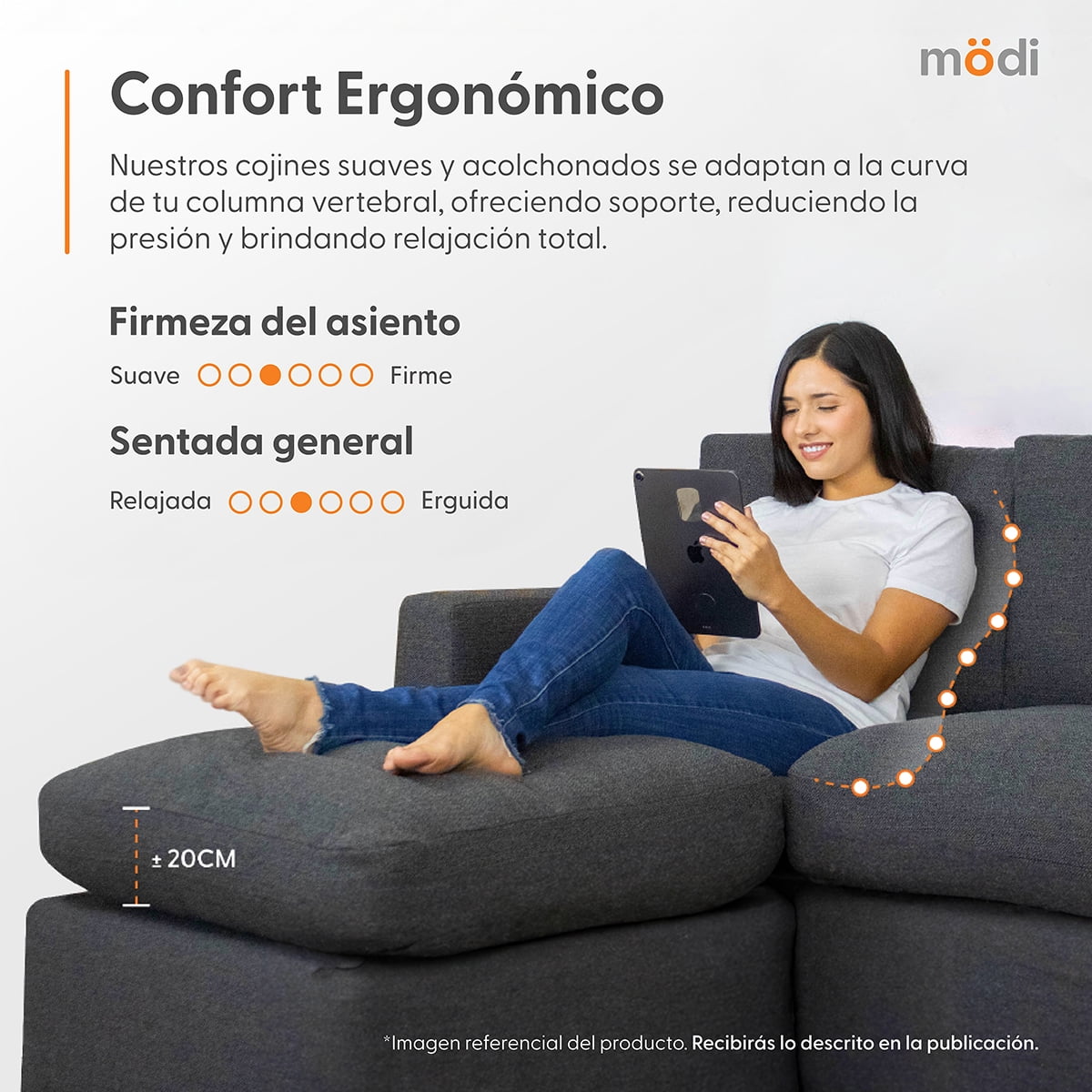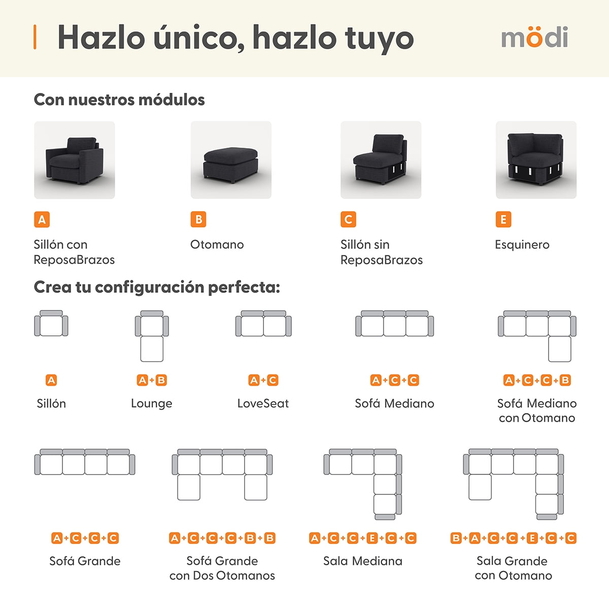 Experimenta el máximo confort con nuestro Set de LoveSeat y Sillón de tres plazas ADAPTI, la solución completa para tu espacio de descanso. Este Set incluye cinco Módulos C (Sillones Sin RepozaBrazos) y dos Módulos D (RepozaBrazos), entregados en siete cajas prácticas. Esta configuración versátil te permite disfrutar de múltiples opciones de asiento, desde una posición tradicional hasta un espacio tipo lounge, perfecto para compartir momentos de relajación.Descubre la comodidad y flexibilidad de MÖDI ADAPTI, el sofá modular que evoluciona contigo. Con su estructura ergonómica y materiales de alta calidad, MÖDI ofrece una experiencia de descanso única, adaptándose a cualquier espacio y estilo de vida. Fabricado orgullosamente en México, nuestro sofá combina estilo, confort y responsabilidad ambiental, ideal para quienes buscan un equilibrio entre calidad y sostenibilidad.Características Principales:CONFIGURACIÓN PERSONALIZABLE - Combina diferentes módulos para crear la configuración perfecta. Desde un loveseat hasta una sala en L ó en U grande, ¡ADAPTI se adapta a cualquier espacio!CONFORT ERGONÓMICO - Cojines con espuma viscoelástica y Nano Memory Foam que brindan soporte y comodidad. Diseñado para adaptarse a la curvatura de tu columna y ofrecer una experiencia de relajación total.FUNDAS REMOVIBLES Y LAVABLES - Fácil de mantener como nuevo con fundas de tela removibles y lavables. Perfecto para hogares modernos y familias con niños o mascotas.ENTREGA EN CAJAS DE FÁCIL MANEJO - Diseñado para una entrega conveniente en cajas individuales, fáciles de manejar y ensamblar. Ideal para espacios pequeños o departamentos donde el acceso es limitado.FABRICADO EN MÉXICO CON MATERIALES DE ALTA CALIDAD - Construido con estructura de madera FSC y acabados de alta calidad. Un sofá modular duradero y sostenible que resalta el diseño y la calidad mexicana.