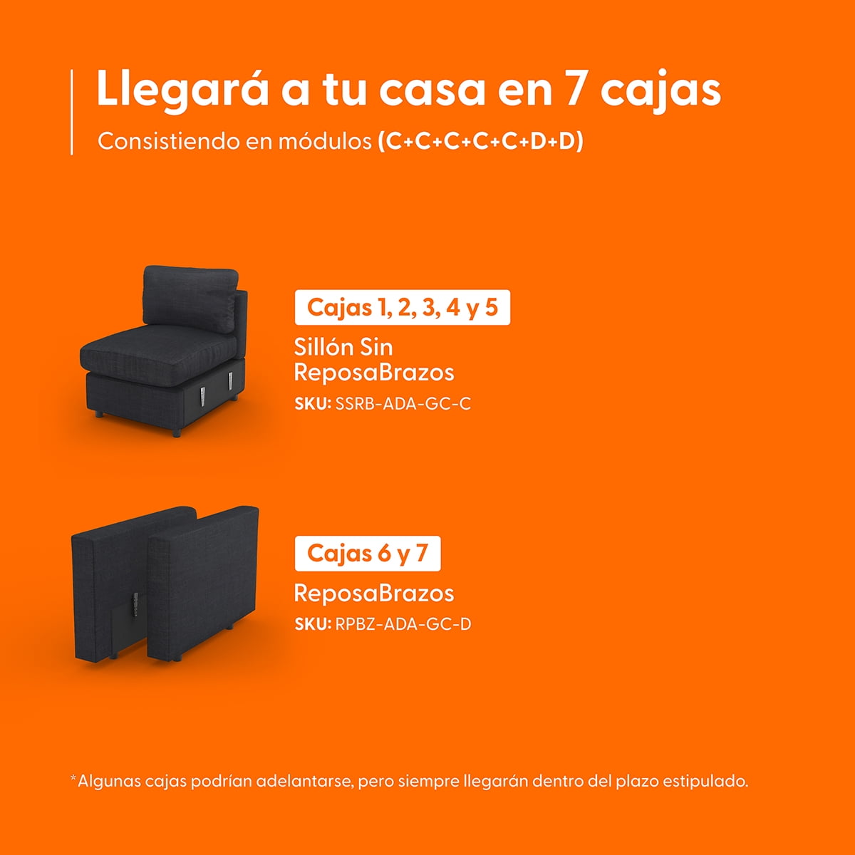 - Experimenta el máximo confort con nuestro Set de LoveSeat y Sillón Individual ADAPTI, la solución completa para tu espacio de descanso. Este Set incluye cinco Módulos C (Sillones Sin RepozaBrazos) y dos Módulos D (RepozaBrazos), entregados en siete cajas prácticas.