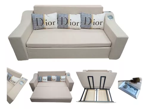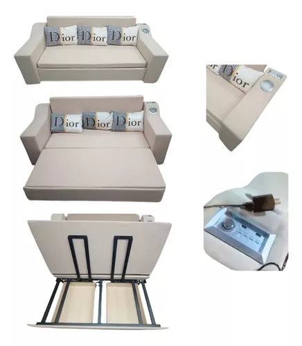 Sofa de dos/tres plazas convertible en cama con cajonera parlantes y cargador de usb.