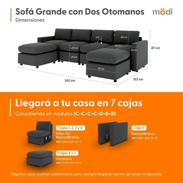 Lleva tu sala al siguiente nivel con nuestro Sofá Grande con Dos Otomanos MÖDI ADAPTI, la configuración más completa de la línea sofá. Este kit premium incluye cuatro Módulos C (Sillones Sin RepozaBrazos), un Módulo D (RepozaBrazos) y dos Módulos B (Otomanos), llegando en siete cajas prácticas. Con dimensiones generosas (262x153x87cm) y múltiples opciones de disposición, es la solución definitiva para quienes buscan máxima versatilidad y confort, permitiendo crear diversos ambientes en un mismo espacio.