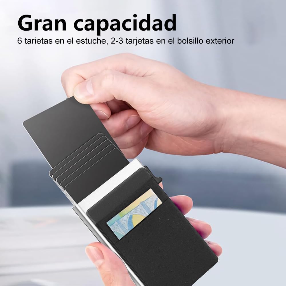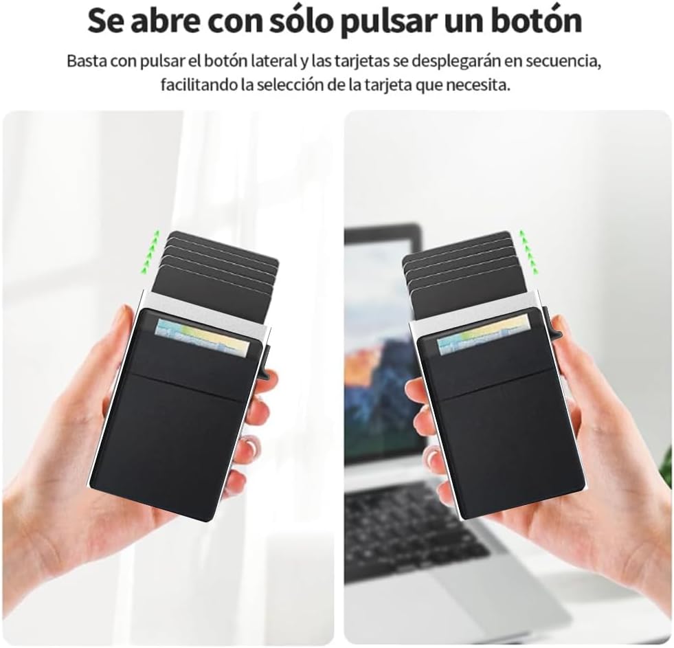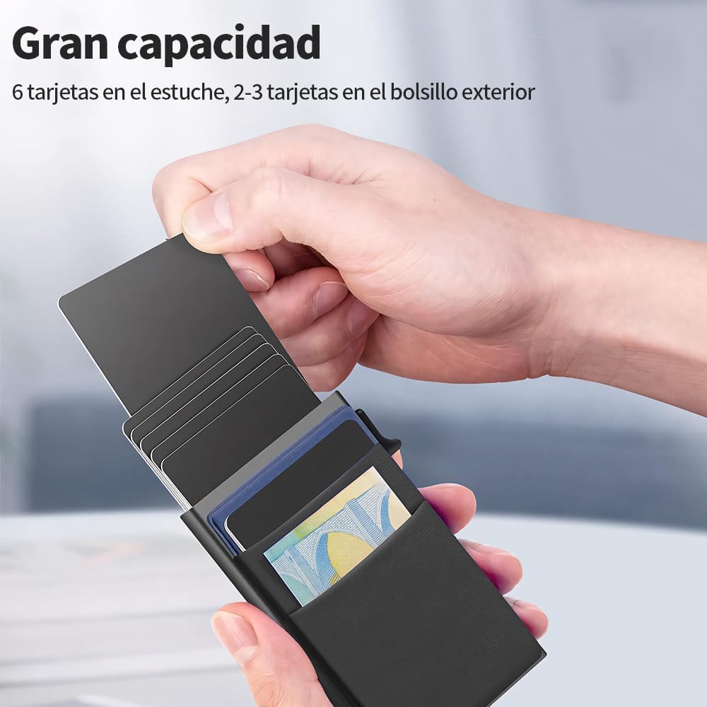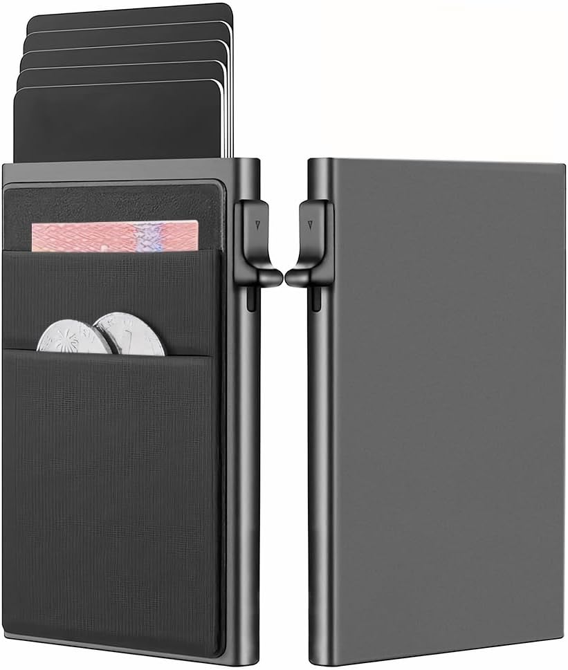 - 【Compacto, Eficiente y de Gran Capacidad】vantisan billetera automática de tarjetas emergentes permite extraer tarjetas con un solo clic, eliminando métodos de búsqueda engorrosos. Fabricada en aleación de aluminio 6061-T6 de grado aeronáutico, es duradera y elegante. Su compartimento principal almacena hasta 6 tarjetas, con 2 ranuras adicionales para 2-3 tarjetas y algunos billetes, ajustándose al grosor de las tarjetas para mayor comodidad.