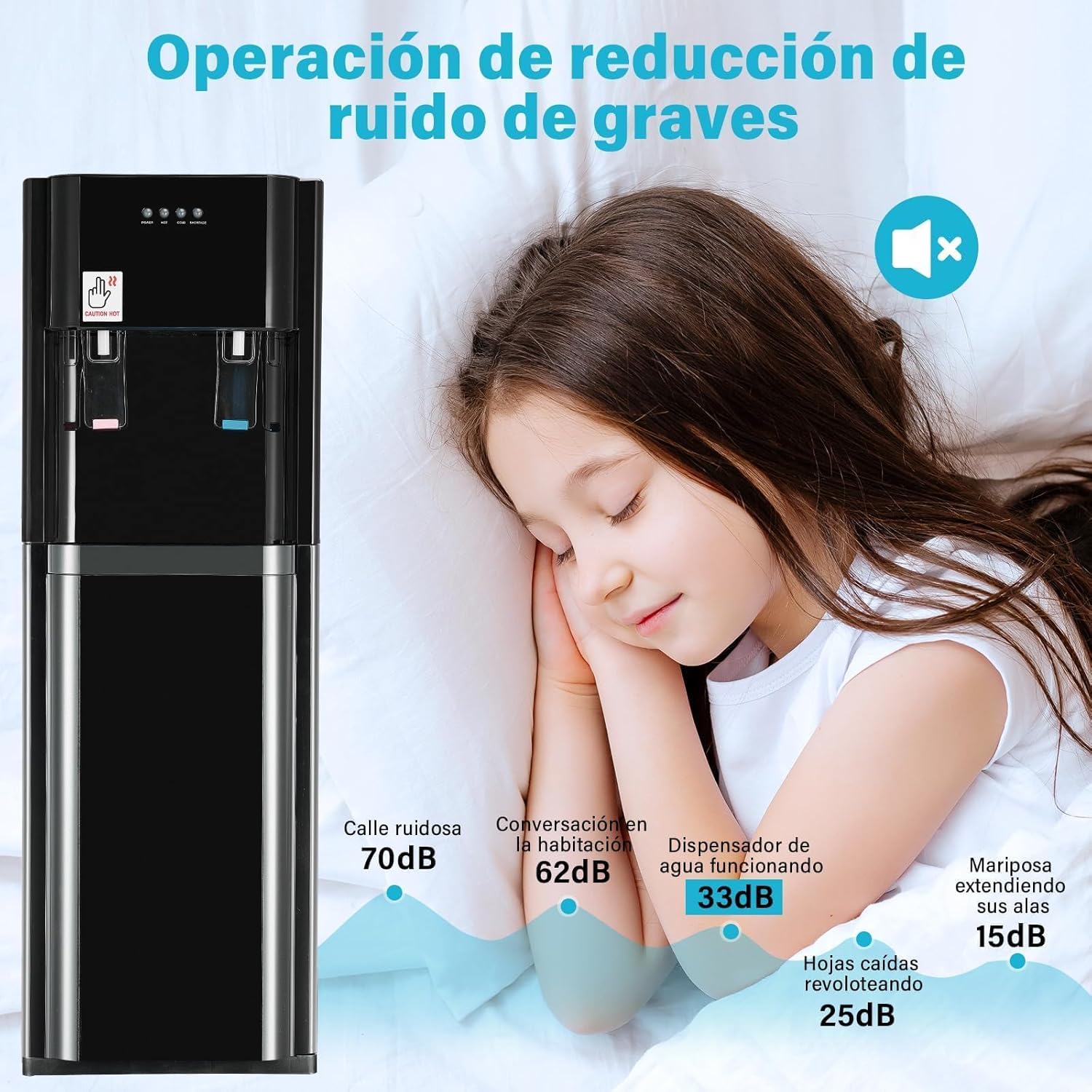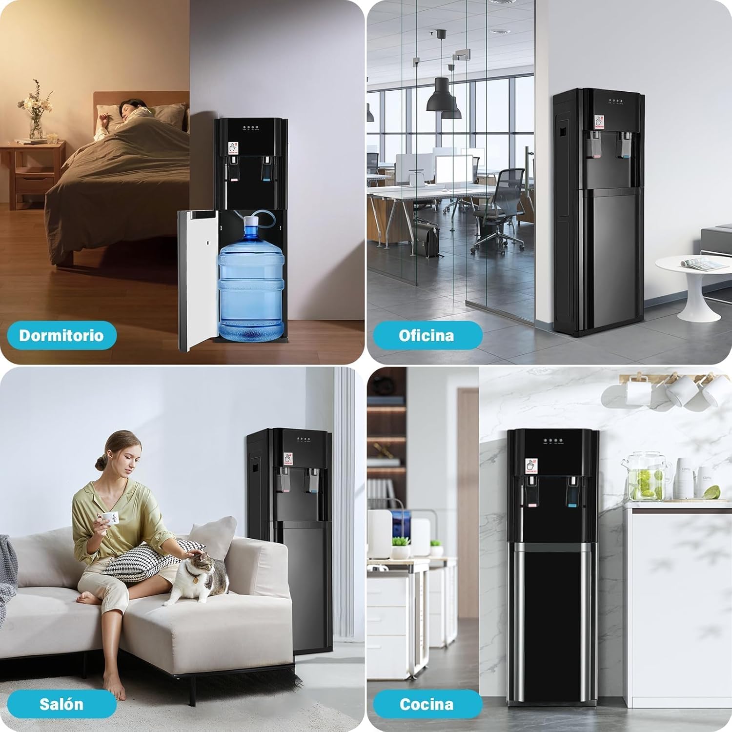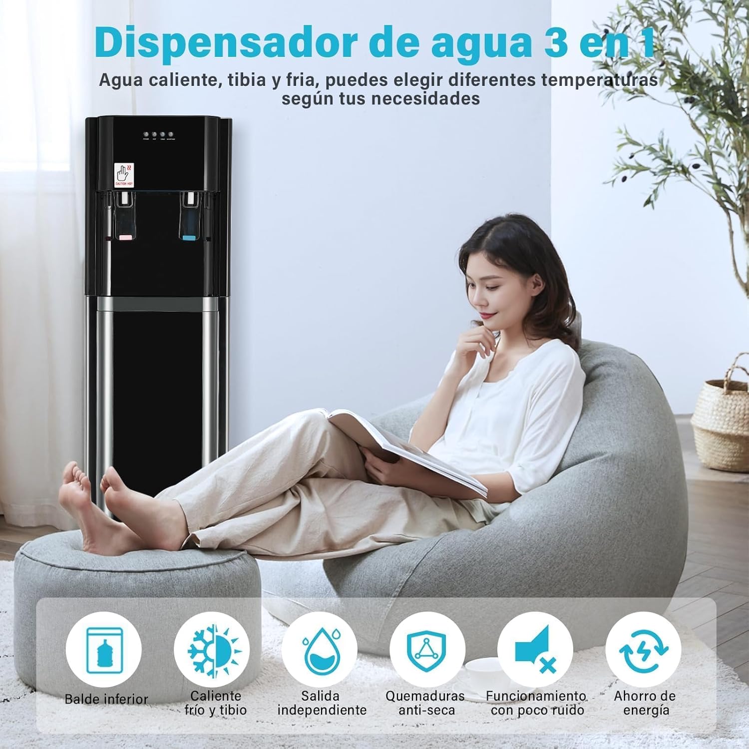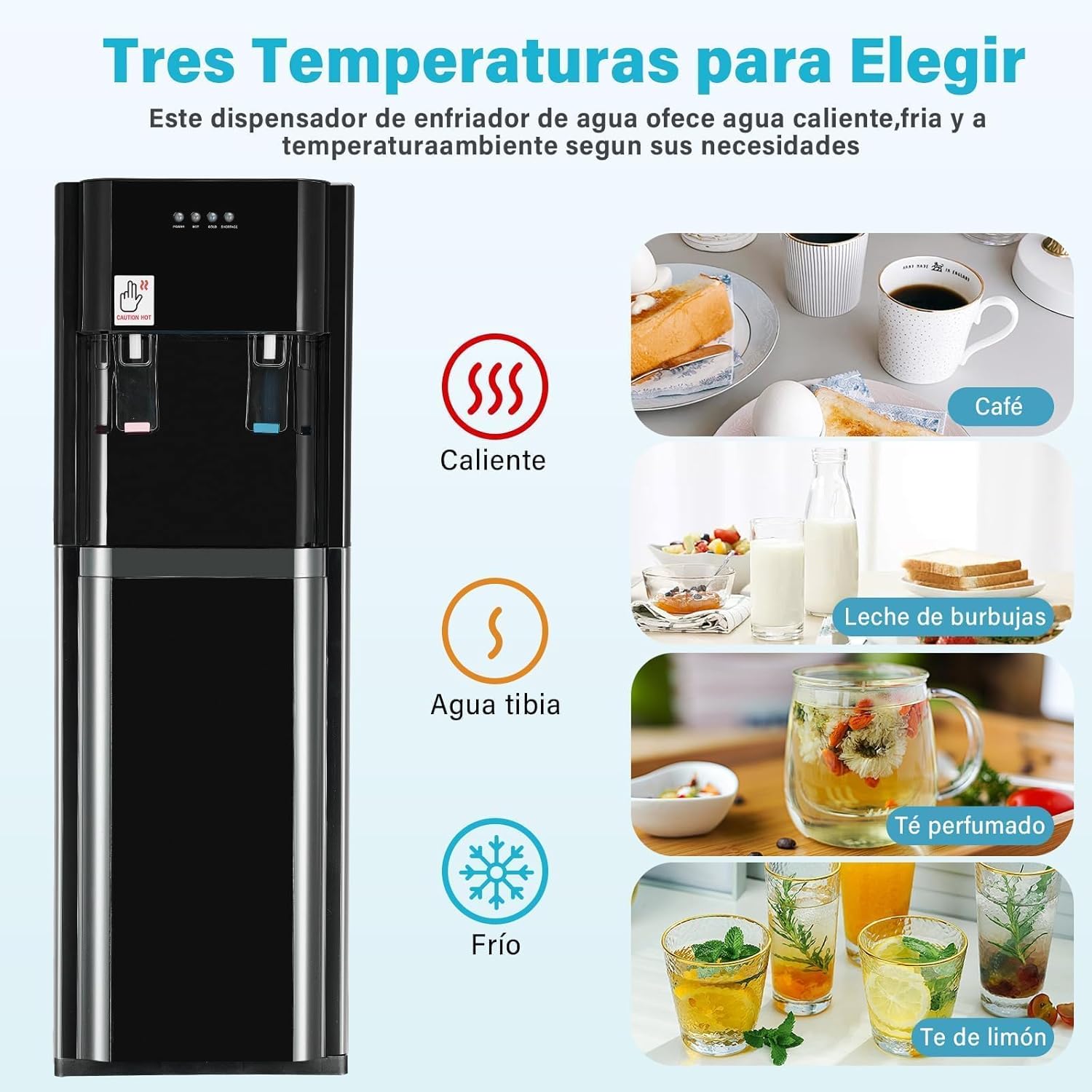 - Tres Opciones de Temperatura: Nuestro enfriador de agua le permite elegir entre agua fría, agua a temperatura ambiente y agua caliente para que pueda beber agua helada en el caluroso verano o tener agua caliente disponible cuando hace frío. Para satisfacer las necesidades diarias de agua potable, brind a ndote a ti y a tu familia un cuidado meticuloso.