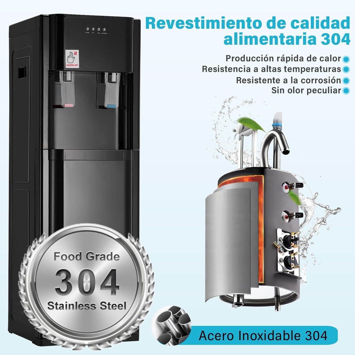 - Agua Potable Saludable: El dispensador de agua fría y caliente utiliza un tanque interior 304 de grado alimenticio, que no es fácil de escalar y es seguro para beber, por lo que puede elegirlo con confianza. Y el panel de control con luces indicadoras puede mostrar claramente las opciones de temperatura del agua, lo cual es muy fácil de usar.