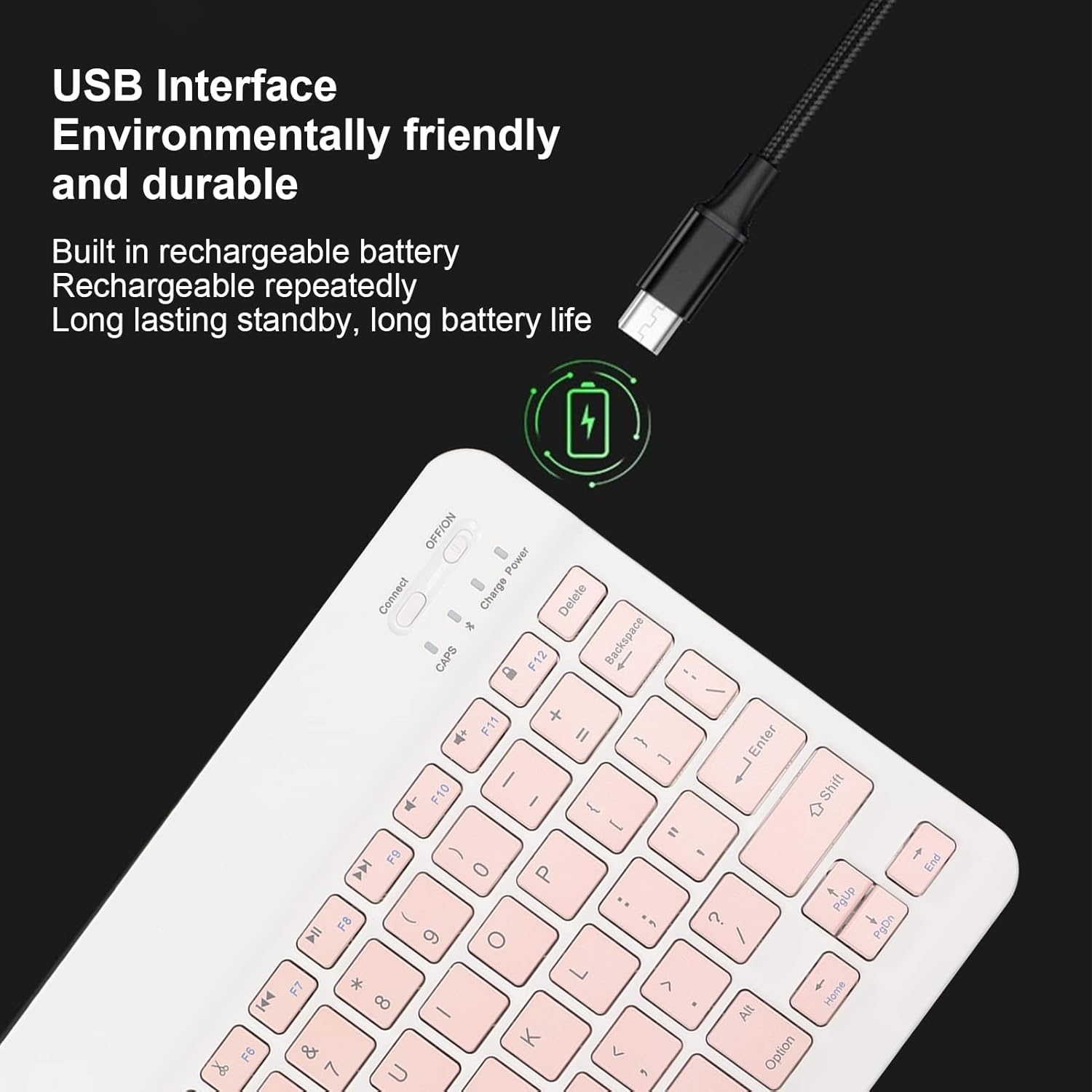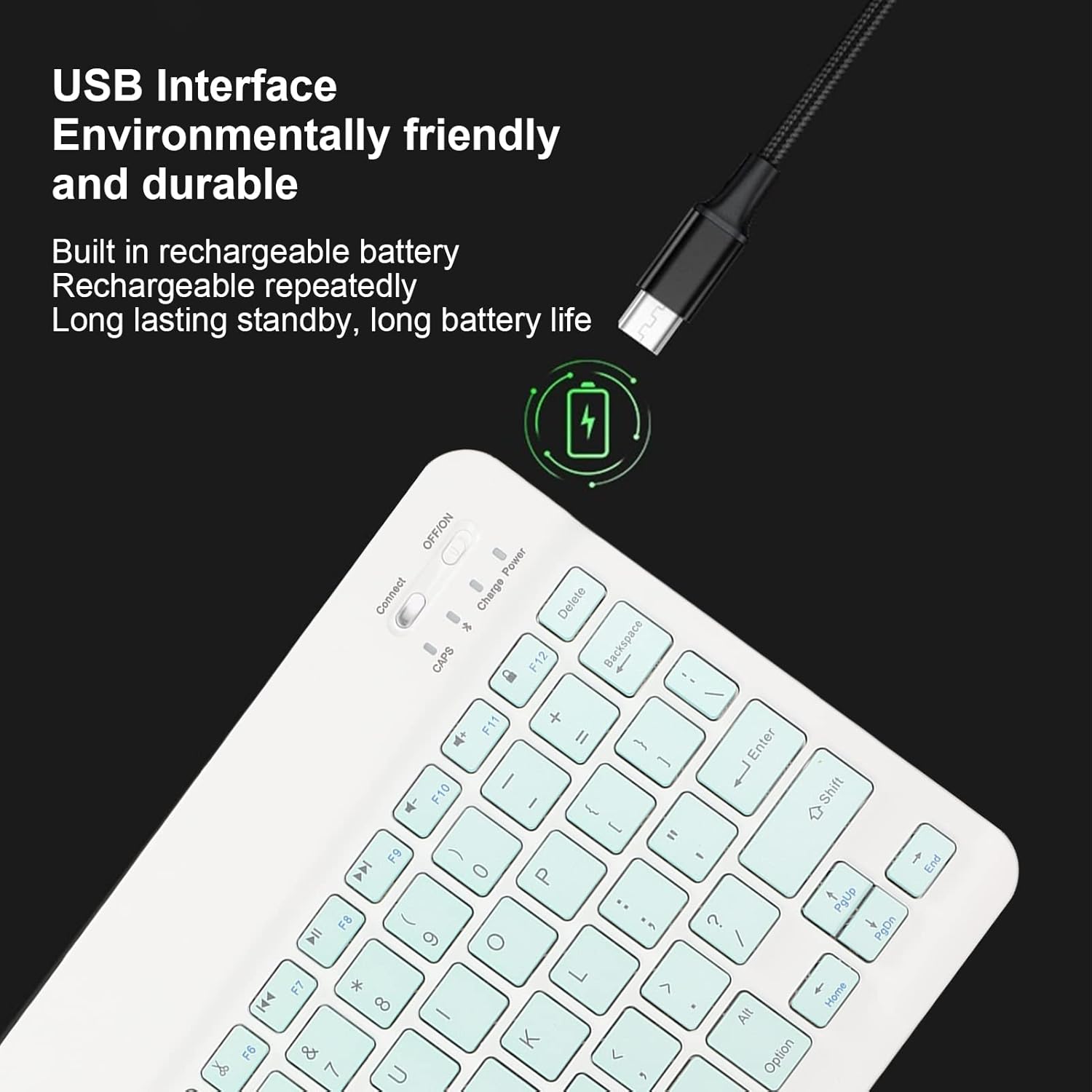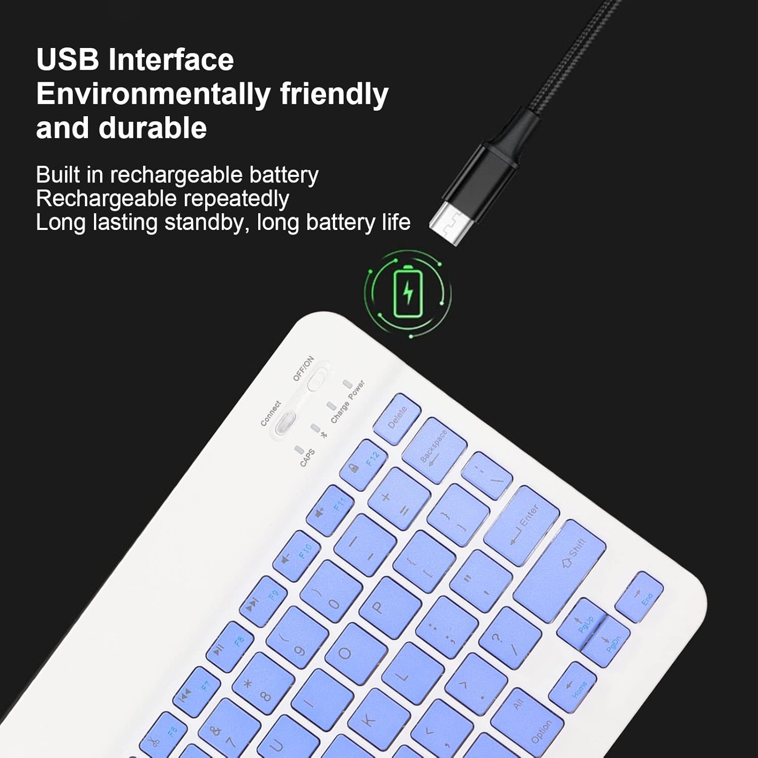 - [Carga Por Usb] El cable de datos del teclado bt es de interfaz usb, con una batería recargable incorporada, que se puede recargar repetidamente, ecológico y duradero, con una larga vida útil de la batería.